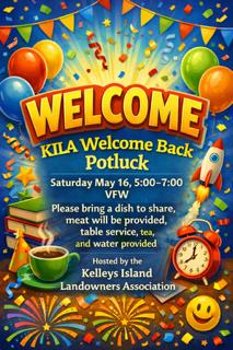 KILA is hosting a welcome back pot luck on Saturday May 16th at the VFW pavilion from 5-7 pm. EVERYBODY Welcome